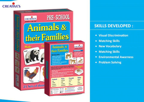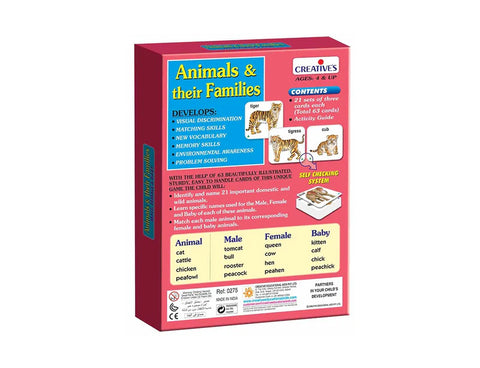 Animal & their Families consists of 21 sets of self-correcting cards of important domestic and wild animals along with their families and an Activity Guide. In this game, children can identify and learn specific names of males, females and babies of these animals.