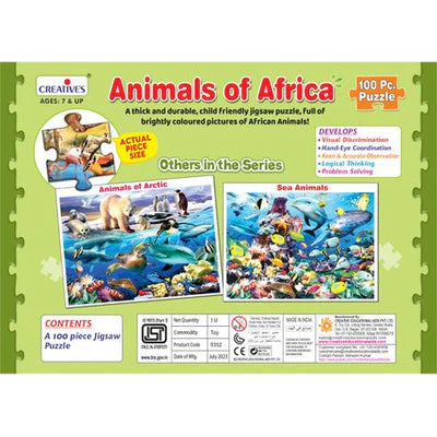 Creatives Animals Of Africa puzzle, This colourful laminated beautiful scene jigsaw puzzle will keep your children entertained for hours as they assemble these 100 self-correcting pieces. Assembling puzzles is more than just fun! It develops logical thinking and problem-solving skills, memory, and concentration, and builds confidence.