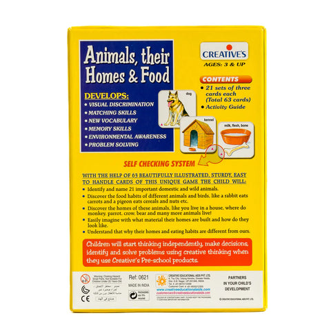 Animals their homes and food’ consists of 21 sets of self-correcting cards of common domestic and wild animals along with their homes and food and an ‘Activity Guide’. In this game, children can identify animals and their homes while learning about the eating habits of animals.