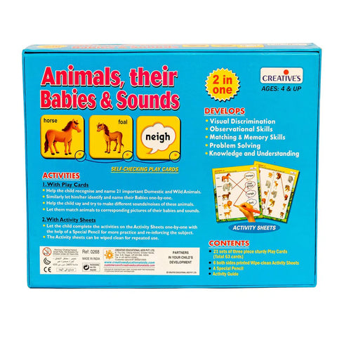 The child is required to match male cards to their corresponding Female & Baby cards. They can also check their answers from the activity guide or with the help of the symbols given on the cards. The game is curriculum based and helps children in their academic learning while developing their visual discrimination and matching skills.