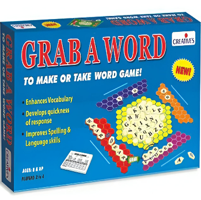 Grab A Word is a make-or-take word game where children grab and form a maximum number of scoring words. The game comprises a Play Board, 100 tiles and a sand timer. The child is required to carefully observe face-up letters and spot a word with three or more letters and place it in front of him.