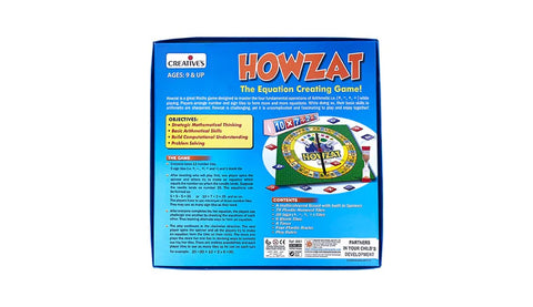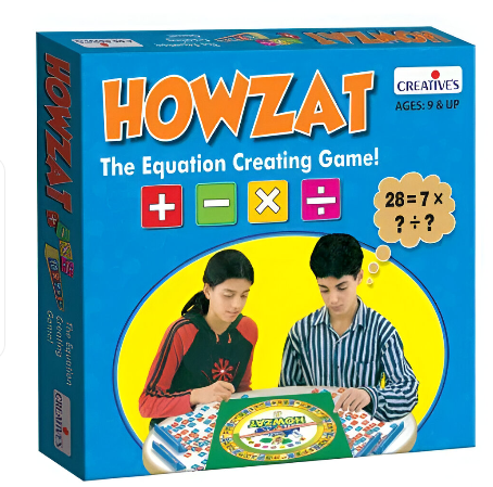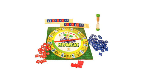 Howzat is a fun way to engage children to practice maths operations. The game comprises a multicoloured pointer-disk, 78 plastic Numeral Tiles, 30 Sign Tiles, 6 Blank Tiles, 4 Plastic Racks, Timer and Play Rules.