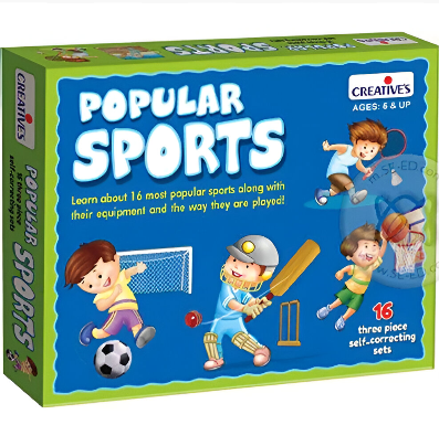 'Popular Sports’ introduces children to 16 popular sports. The game consists of 16 sets of three piece self-correcting puzzles depicting the name of the game, equipment used and the way it is played. The child is required to correctly match the three corresponding pieces of a game. This way, while playing this game, children will not only improve their knowledge about some popular sports but will also understand the importance of physical activities in their lives. The game also includes information sheets about these sports to enhance their understanding of these games. The game will also help children in improving their concentration and developing their matching and visual discrimination skills.