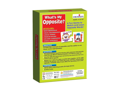 The game has been designed to help children to understand the concept of opposites in an exciting way. Opposite words learning is an essential part of every school curriculum. Give your child the edge with this original product line from Creatives which makes learning fun!