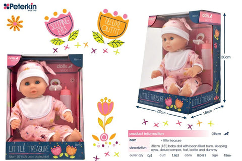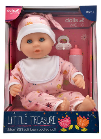 Introducing the new Dollsworld Little Treasure, the perfect cuddle buddy for your young ones. With a soft body made for hugs and snuggles, this first doll is sure to bring joy to your child's playtime. With baby blue eyes and a beautiful face, this 38cm (15") dolly has a bean-filled bum that ensures Little Treasure sits up when required - and when it's time for a nap, the eyes close when you lay your baby down to sleep. The doll is supplied with a deluxe removable light pink flower print romper suit and matching hat, plus a bottle and dummy.