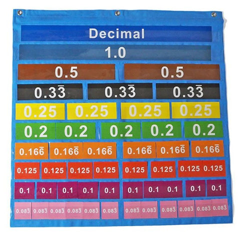 Decimal Pocket Charts are a clear and convenient way to demonstrate the decimal system and the way numbers are constructed. Each chart includes removable plastic numeral cards. Convey a concrete understanding of equivalencies using a color-coded decimal chart. Includes 51 proportionately sized pieces representing decimals from 1 whole to 0,1. In 9 different colours.