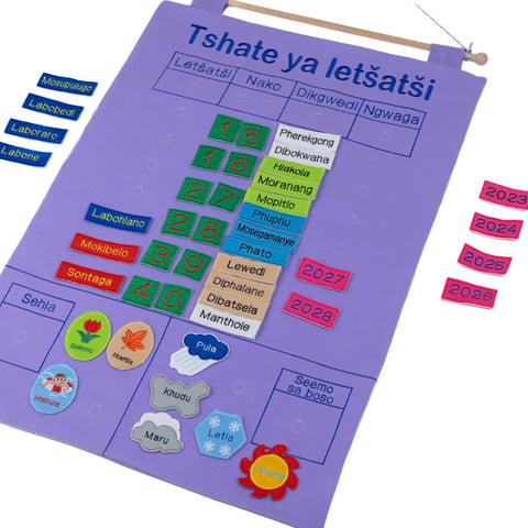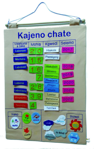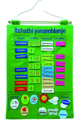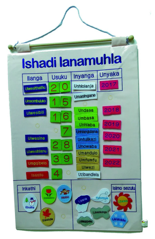 The 47 detachable pieces come in bright colours and are beautifully embroidered. This wall hanging is in English, Afrikaans, isiZulu, Sesotho, isiXhosa, Sepedi, Setswana