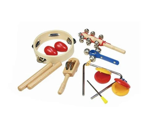 1 x Pair Percussion Claves, 1 x Tambourine, 1 x Cluster Bells, 1 x Triangle with stick, 1 x Jingle Stick, 1 x Pair Egg Shakers ,1 x Pair Castanets, 1 x Rhythm Clapper