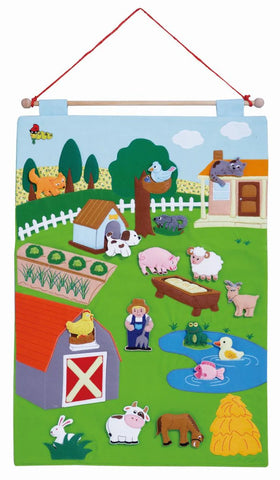 The wall hanging chart is designed to be used as an educational and interactive wall decoration for your classroom, bedroom or playroom. You can use it for story time in a circle, and roll it up for easy storage. It has 16 felt motifs that hook & loop or slides. The felt pieces that have hook & loop stitched onto the backs are removable. This scene provides multiple pathways to teach a variety of skills including: receptive language, articulation of animal sounds, identifying objects by description, and much more.