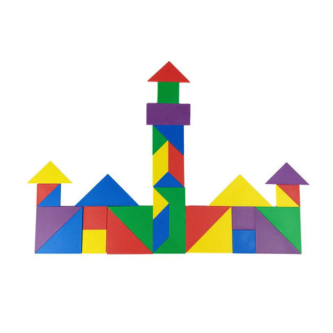 The tangram pieces are made of plastic. 7 Pieces make one square. The tangram is an ancient Chinese puzzle consisting of a square divided into these seven geometric shapes. The plastic pieces are easy for young children to manipulate, and can be used for classwork or creative play. Some activity ideas are listed below.
