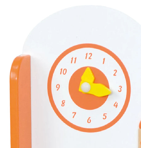 A colourful kitchen combination with sink, stove and oven is accompanied by a clock and accessories. Accessories include a cooking spoon, 2 different spatulas, salt and pepper jars, a frying pan and pot with lid. Easy to assemble