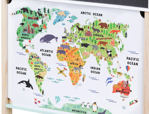 - The back of the kitchen unit has an Illustrated world map and a black chalkboard.