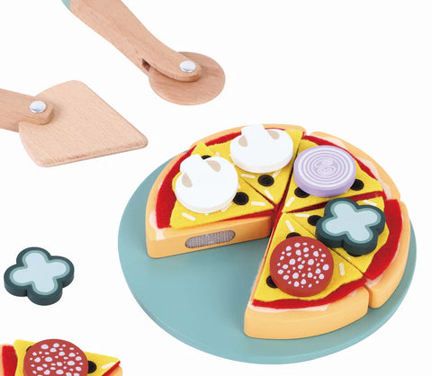 Indulge in a pizza party with this fun wooden pizza set! Build your pizzas with the included toppings and cutter. Encourages imaginative play and fine motor skills. (Slice up some fun with this unique toy set!)