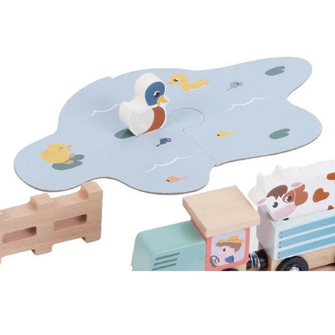 Wooden toy farm train set with farm animals and magnetic carrier on inter locking tracks.