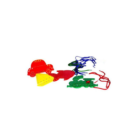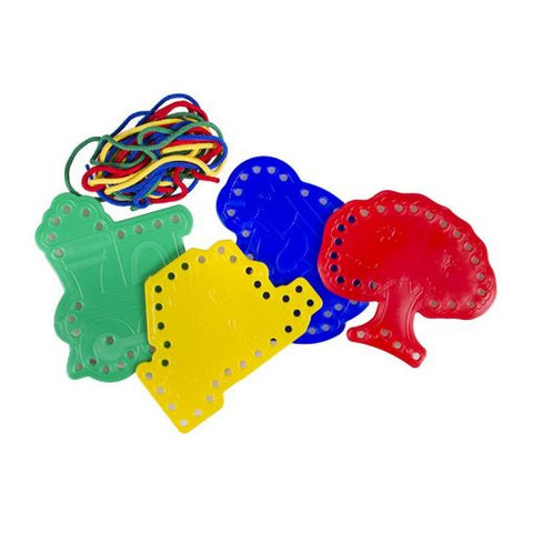 Threading shapes is a fun way to learn how to tread. The holes in the threading shapes are large to make them easier for small children to use. Threading practices hand-eye coordination, hand muscles, fine motor skills and bilateral integration. The children can be creative and tread the shapes in different ways, e.g. plain stitches, cross stitches, etc. One can also use the threading shapes for other activities besides treading, e.g. naming the shapes or colours as well as sorting them. Children can also use the shapes as stencils to draw with or make dot-to-dot pictures. Using shapes for drawing develops visual discrimination as well as the skills necessary for writing and dressing.