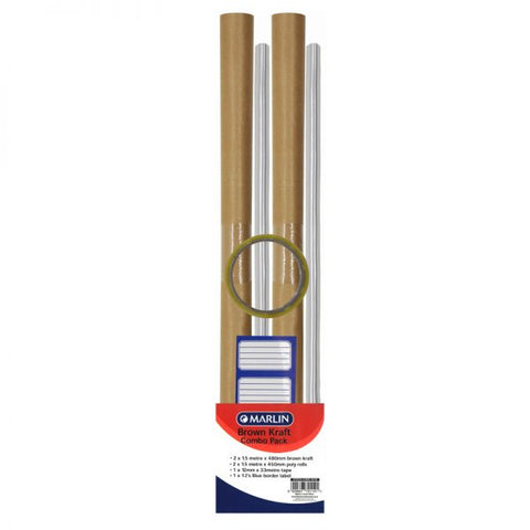 - Marlin 10pc Combo pack: 4 x Brown Kraft Rolls 480 x 700mm, 4 x Poly Rolls 480 x 700mm x 30micron, 12 x Blue Border Labels, 1 x Stationery Tape 12mm x 20mtr x 38micron