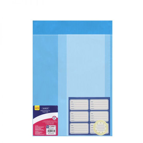 - Marlin Book Cover Pre-cut Colour Kraft Combo 17pc (5 x Slip On Covers, 5 x Precut covers, 1 x Stationery Tape 12mm x 20m x 38micron, 6 x Blue Border Labels). One colour per Combo, assorted colours per pack