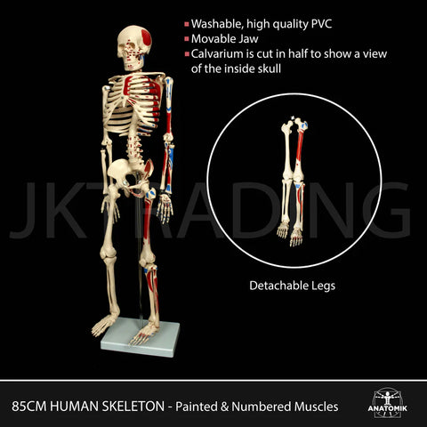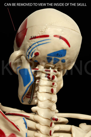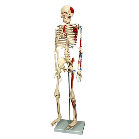 This skeleton model is ideal for teaching the basics of anatomy depicting the position, course and distribution of main insertions and origins of muscles throughout human body. The anatomy model is suitable for medical and massage students and professionals, doctors, dentists, chiropractors, physical therapists and instructors
